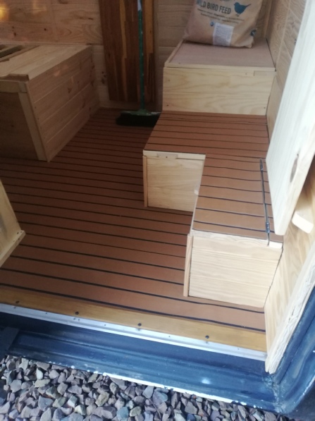 J’ai du coup choisis un sol souple utilisé sur des ponts de bateau, la matière fait 6mms d’épaisseur et résistante a l’eau et aux UV.
